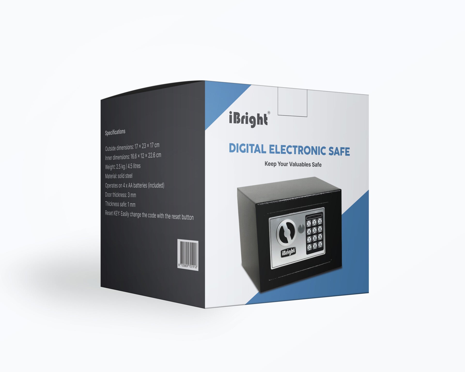 iBright elektronische kluis werkt op batterijen en heeft 3 indicator lampjes: groen (kluis is open), rood (batterij bijna leeg) en geel (waarschuwing). Hij is gemaakt van massief staal en weegt 2,5 kg. Je kunt zelf een 3 tot 8-cijferige code verzinnen. Bij het vergeten van de code gebruik je de bijgevoegde noodsleutels.