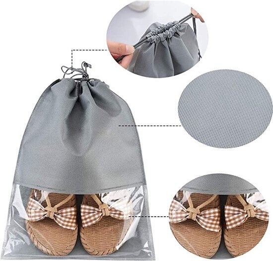 Bescherm je schoenen tijdens het reizen. De schoenenzak past gemakkelijk in uw koffer en de schoenen zak is ook nog eens waterdicht. Hierdoor zal jouw kleding niet vies worden omdat je schoenen gescheiden zijn van je kleding. De schoenen zak is voorzien van doorzichtige plastic. Hierdoor kun je altijd zien welke schoenen er in de schoenen zak zitten. De schoenen zak is gemaakt van milieuvriendelijk materiaal. Een must-have voor als je op vakantie gaat of omdat je je schoenen netjes wilt houden.